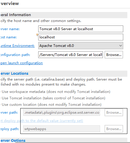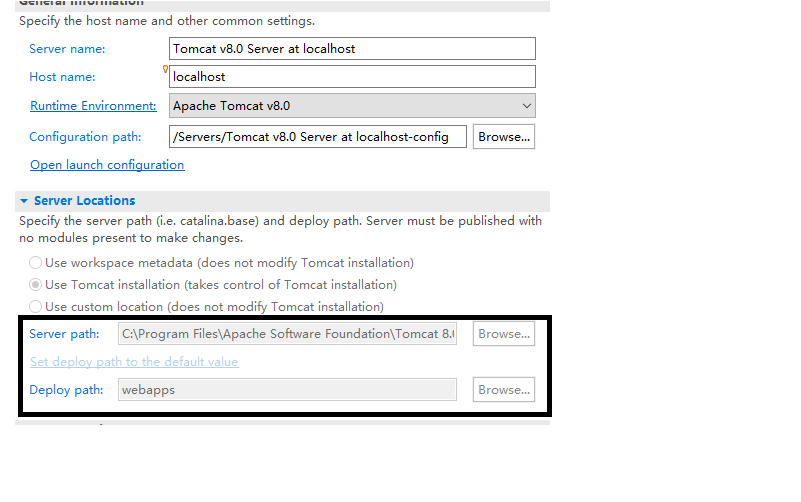 通過咨詢JAVA群中的大神,我查看了一下Tomcat文件夾中的webapps文件夾,發(fā)現(xiàn)里面并沒有我的項目,但是我確實是把項目部署進去了,于是我查看了一下我的Tomcat的server頁 發(fā)現(xiàn)里面的Tomcat路徑不對,是默認的eclipse里面的路徑,所以導(dǎo)致了Tomcat的部署失敗: