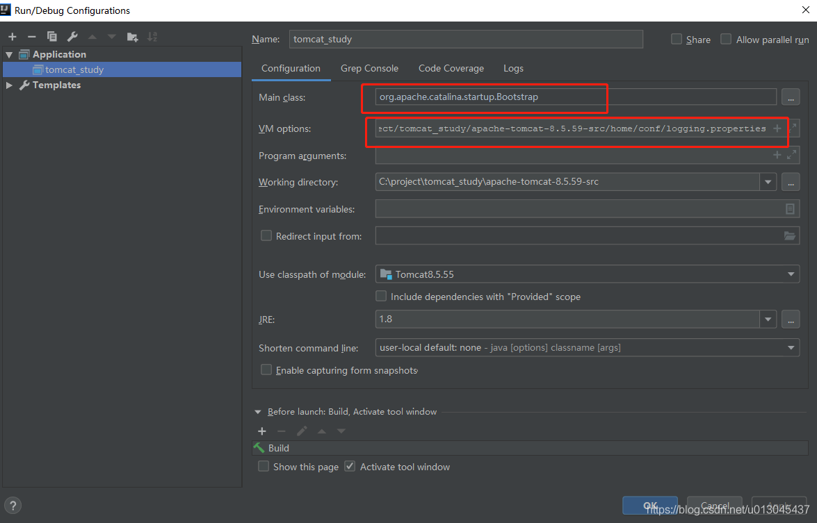Main class:org.apache.catalina.startup.Bootstrap VM options 按照自己的路徑進行修改:-Dcatalina.home=G:/projects/tomcat_study/apache-tomcat-8.5.55-src/home -Dcatalina.base=G:/projects/tomcat_study/apache-tomcat-8.5.55-src/home -Djava.endorsed.dirs=G:/projects/tomcat_study/apache-tomcat-8.5.55-src/home/endorsed -Djava.io.tmpdir=G:/projects/tomcat_study/apache-tomcat-8.5.55-src/home/temp -Djava.util.logging.manager=org.apache.juli.ClassLoaderLogManager -Djava.util.logging.config.file=G:/projects/tomcat_study/apache-tomcat-8.5.55-src/home/conf/logging.properties