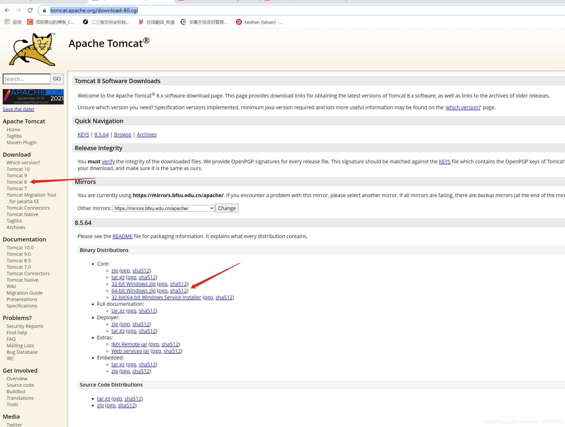 1.到Apache Tomcat 官網(wǎng)下載,tomcat壓縮包,下載地址 https://tomcat.apache.org/download-80.cgi,選擇需要下載的版本。