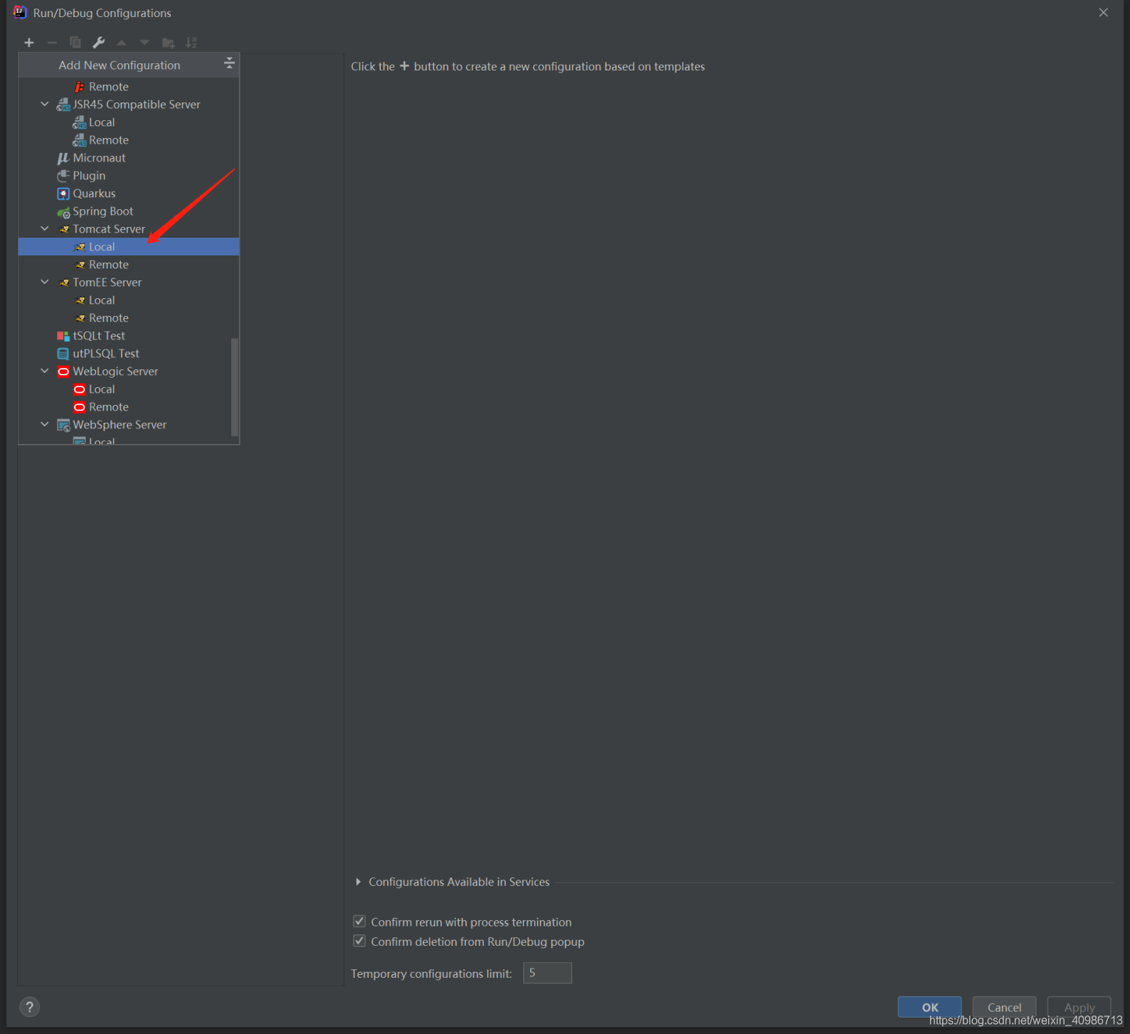 3.打開IDEA 點擊 Add configuration.. 然后點擊 左上角的【+】號,選擇 Tomcat Server -->local
