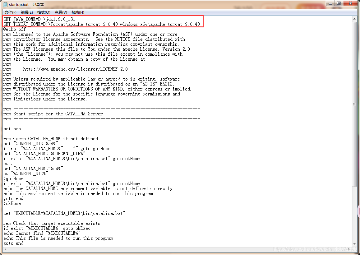 1:在已解壓的tomcat的bin文件夾下找到startup.bat,右擊->編輯。在文件的最上面加入下面兩行: