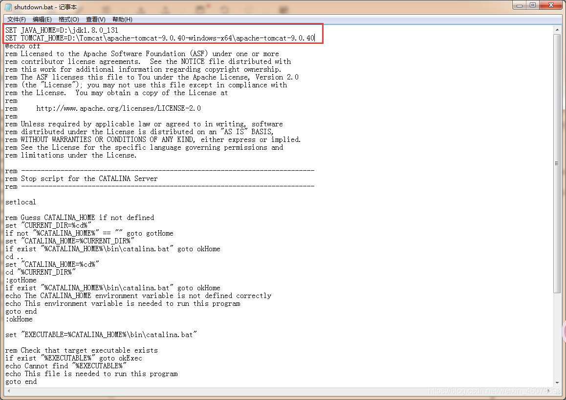 2.在已解壓的tomcat的bin文件夾下找到shutdown.bat,右擊->編輯。在文件頭加入下面兩行: