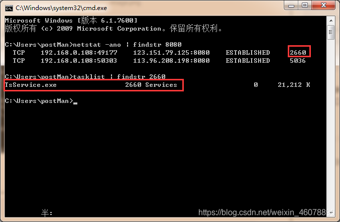 可以看到端口被占用,則可以根據PID(進程Id號)來查看占用端口的是哪個程序,在命令行中輸入