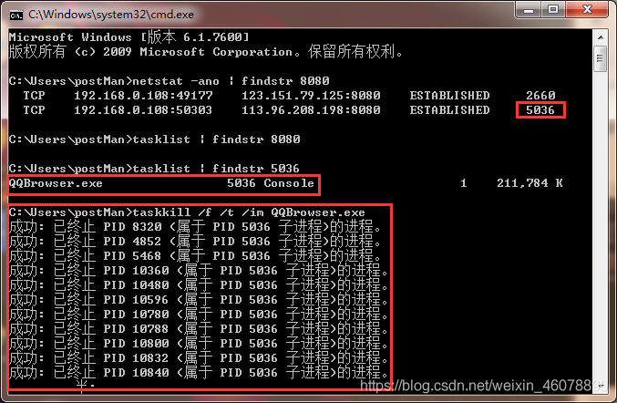 找到占用端口的進程之后,在命令行中輸入