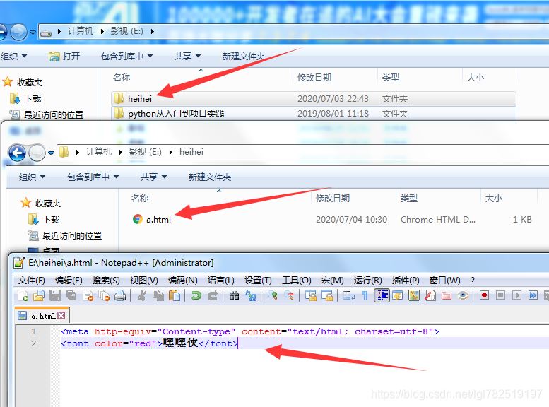 在E盤的文件夾里面定一個heihei項目,里面只有a.html文件,文件內容為你紅色字:嘿嘿俠