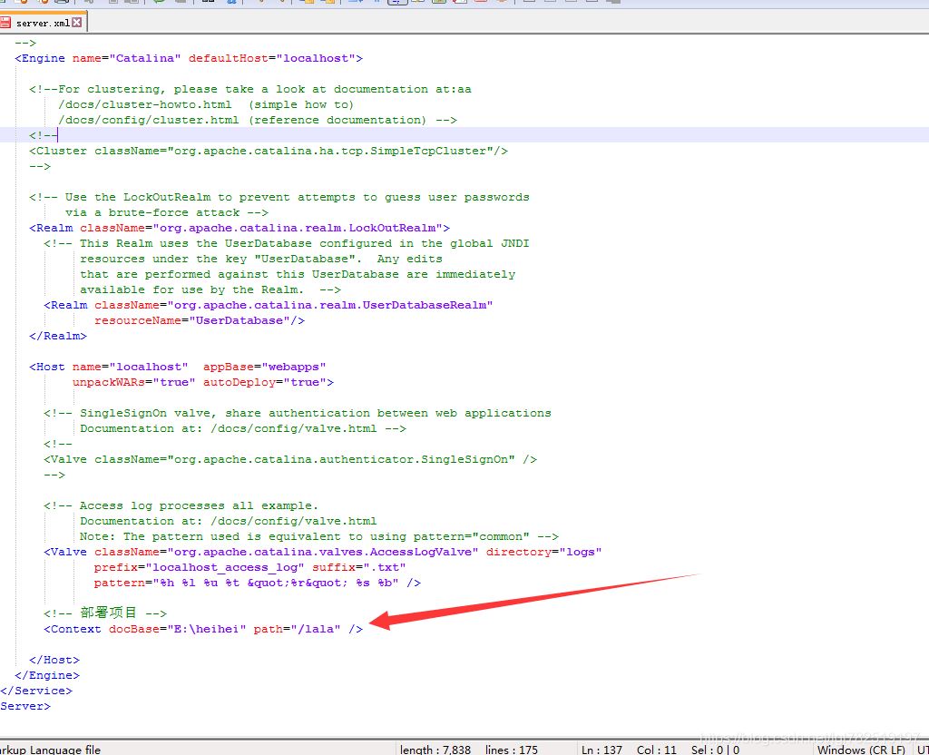 加入以下配置:<Context docBase="E:\heihei" path="/lala" />