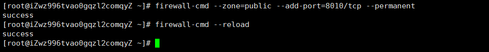 這樣就成功的將8010端口加入了public區域中,permanent參數表示永久生效,即重啟也不會失效,最后不要忘記更新防火墻規則: