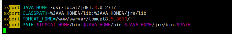 export JAVA_HOME=/usr/local/jdk1.8.0_271/export CLASSPATH=%JAVA_HOME%/lib:%JAVA_HOME%/jre/libexport TOMCAT_HOME=/www/server/tomcat8.5.8010/export PATH=$TOMCAT_HOME/bin:$JAVA_HOME/bin:$JAVA_HOME/jre/bin:$PATH