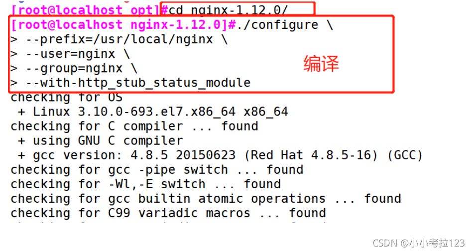 1. #關閉防火墻systemctl stop firewalldsetenforce 0?2. #安裝依賴關系包yum -y install pcre-devel zlib-devel gcc gcc-c++ make?3. #新建用戶和組便于管理useradd -M -s /sbin/nologin nginx?4. #切換至opt目錄,將下載好的壓縮包傳進來解壓cd /opttar -zxf nginx-1.12.0.tar.gz ?4. #切換至解壓后的目錄下編譯cd nginx-1.12.0?./configure