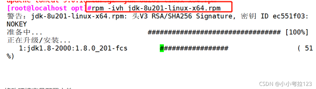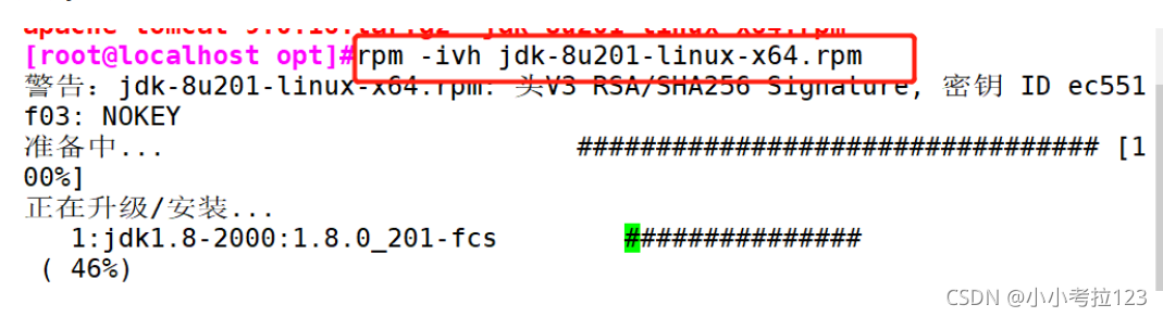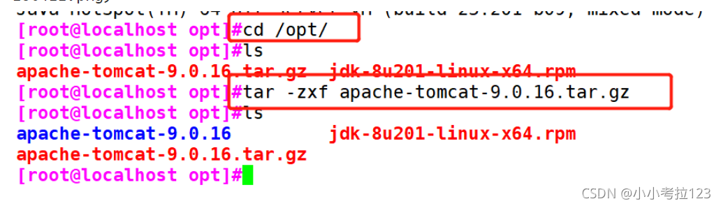 1. #關閉防火墻 systemctl stop firewalldsystemctl disable firewalldsetenforce 0 2. #將安裝 Tomcat 所需軟件包傳到/opt目錄下apache-tomcat-9.0.16.tar.gz jdk-8u201-linux-x64.rpm 3. #切換至/opt下,安裝JDKcd /optrpm -ivh jdk-8u201-linux-x64.rpm ?4. #查看java版本java -version