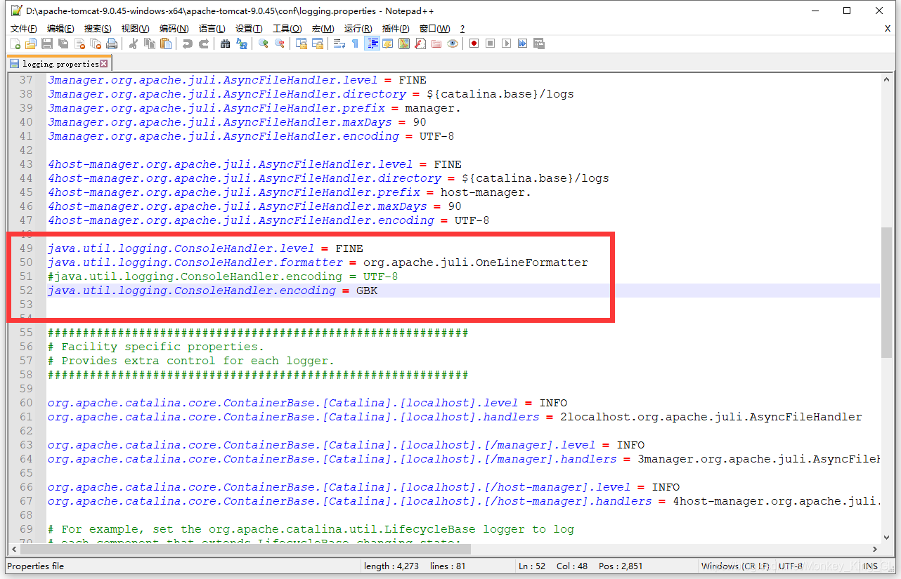 2、將日志的編碼格式也修改一下,打開tomcat的\conf\logging.properties。