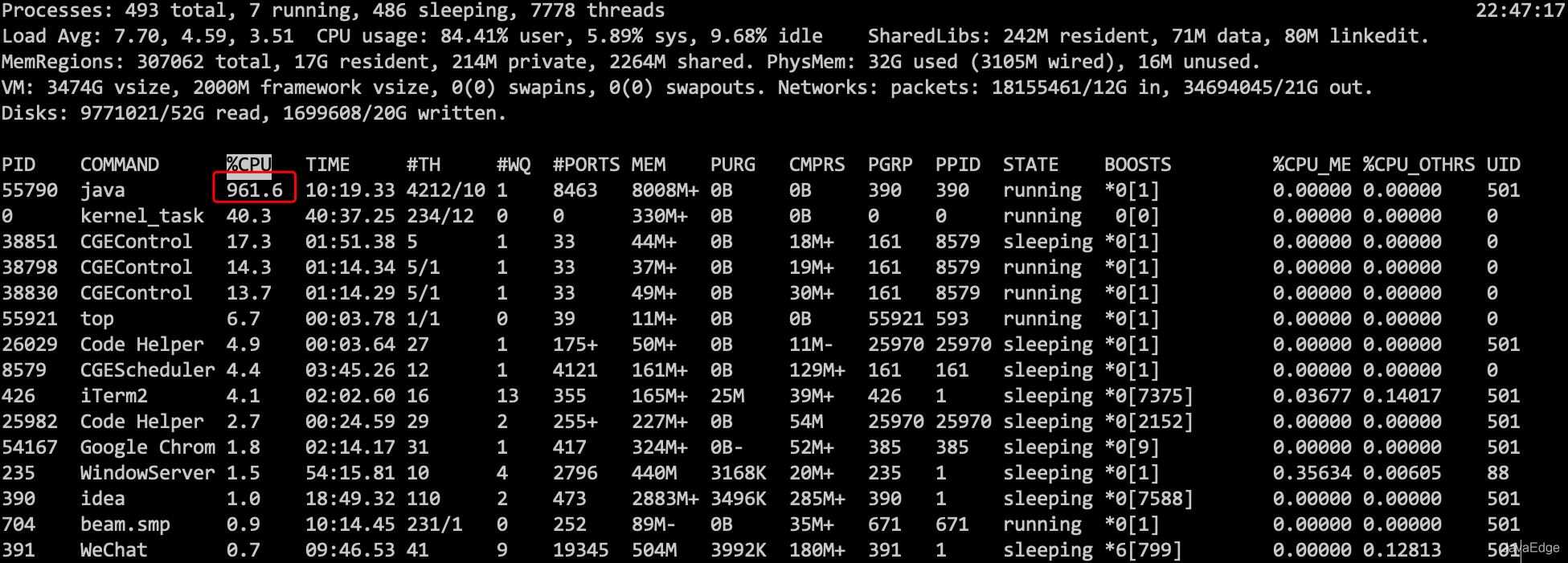 使用top命令,我們看到Java進程的CPU使用率達到了961.6%,注意到進程ID是55790。
