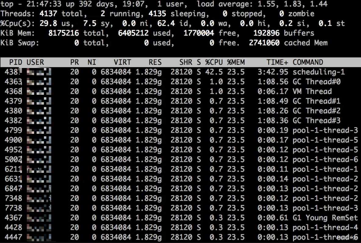 經(jīng)歷上述過程,往往已經(jīng)可以定位到大量消耗CPU的線程及bug代碼,比如死循環(huán)。但對于該案例:Java進程占用的CPU是961.6%, 而“scheduling-1”線程只占用了42.5%的CPU,那其它CPU被誰占用了?