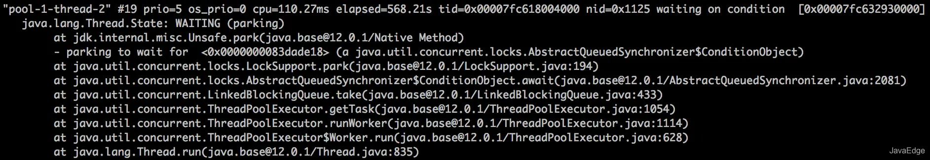 第4步用top -H -p pid命令看到的線程列表中還有許多名為“pool-1-thread-x”的線程,它們單個的CPU使用率不高,但是似乎數(shù)量比較多。你可能已經(jīng)猜到,這些就是線程池中干活的線程。那剩下的CPU是不是被這些線程消耗了呢?
