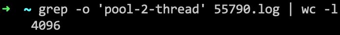回到我們的“pool-1-thread-x”線程,這些線程都處在“Waiting”狀態(tài),從線程棧我們看到,這些線程“等待”在getTask方法調(diào)用上,線程嘗試從線程池的隊列中取任務(wù),但是隊列為空,所以通過LockSupport.park調(diào)用進到了“Waiting”狀態(tài)。那“pool-1-thread-x”線程有多少個呢?通過下面這個命令來統(tǒng)計一下,結(jié)果是4096,正好跟線程池中的線程數(shù)相等。