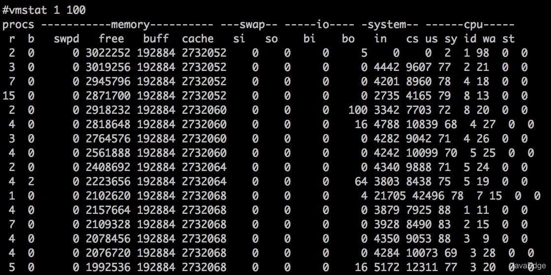 其次還要通jstack查看線程的狀態(tài),看看線程的個數(shù)或者線程的狀態(tài),如果線程數(shù)過多,可以懷疑是線程上下文切換的開銷,我們可以通過vmstat和pidstat這兩個工具進行確認(rèn)。