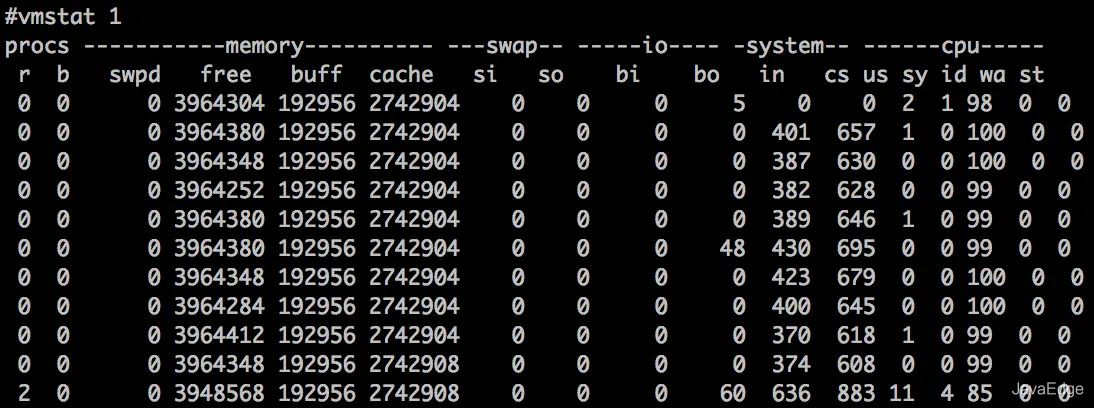 停止Spring Boot程序,再次運行vmstat命令,會看到in和cs都大幅下降,這就證實引起線程上下文切換開銷的Java進程正是55790。
