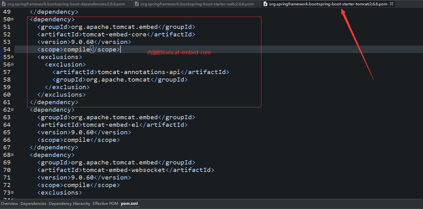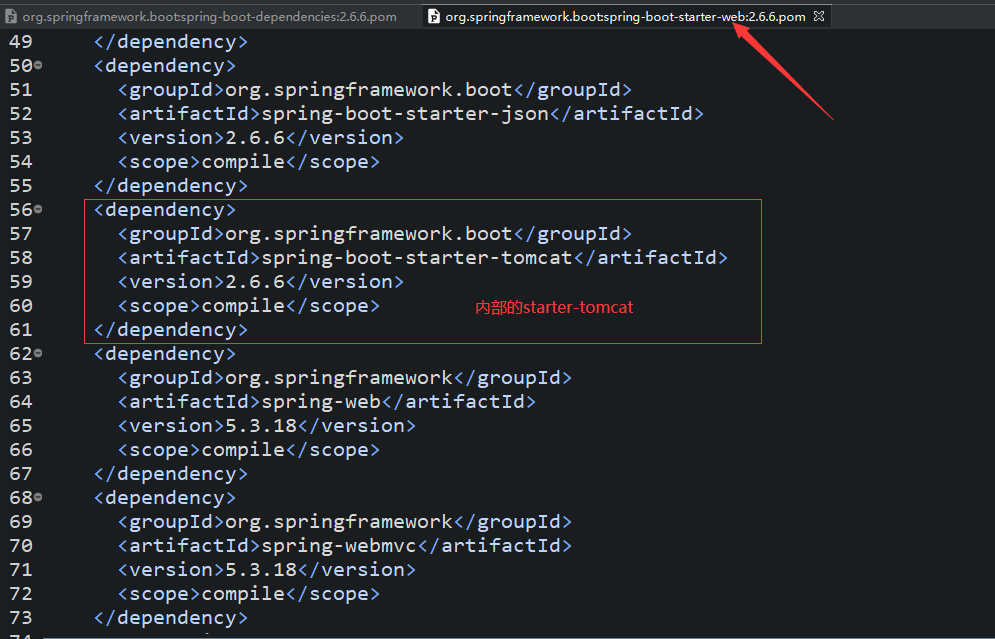 - 在spring-boot-starter-web這個(gè)starter中,其實(shí)內(nèi)部間接的引入了spring-boot-starter-tomcat這個(gè)starter,這個(gè)spring-boot-starter-tomcat又引入了tomcat-embed-core依賴(lài),所以只要我們項(xiàng)目中依賴(lài)了spring-boot-starter-web就相當(dāng)于依賴(lài)了Tomcat。