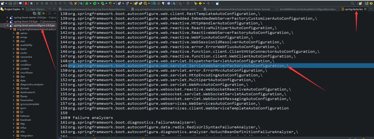 自動(dòng)配置類(lèi):ServletWebServerFactoryAutoConfiguration在spring-boot-autoconfigure-2.6.6.jar這個(gè)包中的spring.factories文件內(nèi),配置了大量的自動(dòng)配置類(lèi),其中就包括自動(dòng)配置tomcat的自動(dòng)配置類(lèi):ServletWebServerFactoryAutoConfiguration
