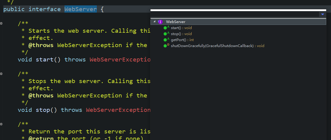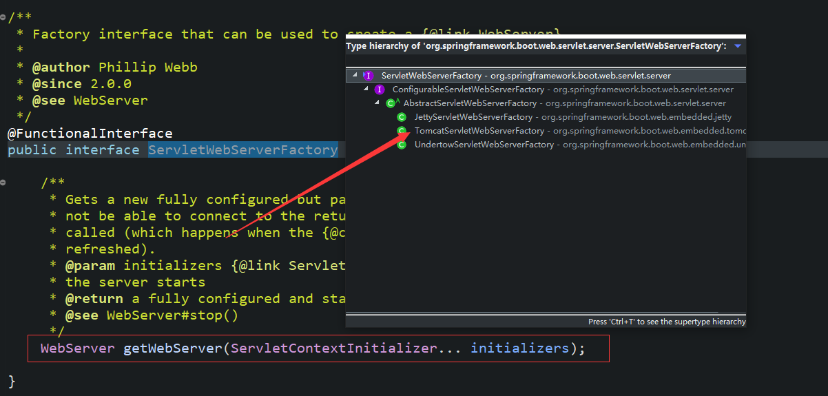 - WebServer擁有啟動(dòng)、停止、獲取端口等方法,就會(huì)發(fā)現(xiàn)WebServer其實(shí)指的就是Tomcat、Jetty、Undertow。