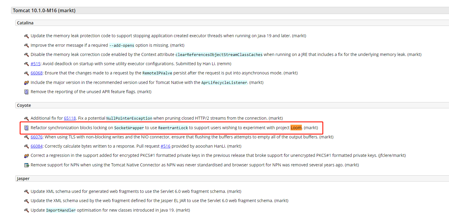 支持Loom項目的Tomcat最低版本為10.1.0-M16,對應的正式版是10.1.0(當前時間為2022-10-07前后),低于此版本因為大量API還沒有適配虛擬線程,主要是沒有改造監視器鎖的引用導致虛擬線程pin到載體(平臺)線程等問題,因此別無他選。另外,重要的提醒說三次: