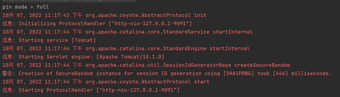 public class EmbedTomcatVirtualThreadDemo { private static final String SERVLET_NAME = "VirtualThreadHandleServlet"; private static final String SERVLET_PATH = "/*"; /** * 設置VM參數: * --add-opens java.base/java.lang=ALL-UNNAMED * --add-opens java.base/java.lang.reflect=ALL-UNNAMED * --add-opens java.base/java.util.concurrent=ALL-UNNAMED * -Djdk.tracePinnedThreads=full * * @param args args * @throws Exception e */ public static void main(String[] args) throws Throwable {String pinMode = System.getProperty("jdk.tracePinnedThreads");System.out.println("pin mode = " + pinMode);Tomcat tomcat = new Tomcat();Context context = tomcat.addContext("", (new File(".")).getAbsolutePath());Tomcat.addServlet(context, SERVLET_NAME, new VirtualThreadHandleServlet());context.addServletMappingDecoded(SERVLET_PATH, SERVLET_NAME);Connector connector = new Connector();ProtocolHandler protocolHandler = connector.getProtocolHandler();if (protocolHandler instanceof AbstractProtocol<?> protocol) { protocol.setAddress(InetAddress.getByName("127.0.0.1")); protocol.setPort(9091); ThreadFactory factory = Thread.ofVirtual().name("embed-tomcat-virtualWorker-", 0).factory(); Class<?> klass = Class.forName("java.util.concurrent.ThreadPerTaskExecutor"); MethodHandle methodHandle = MethodHandles.privateLookupIn(klass, MethodHandles.lookup()) .findStatic(klass, "create", MethodType.methodType(klass, new Class[]{ThreadFactory.class})); ExecutorService executor = (ExecutorService) methodHandle.invoke(factory); protocol.setExecutor(executor);}tomcat.getService().addConnector(connector);tomcat.start(); }}這里VirtualThreadHandleServlet匹配所有格式的請求路徑并且處理所有請求方法類型的請求。默認的虛擬線程調度器沒有為虛擬線程設置名稱,也就是如果使用Executors.newVirtualThreadPerTaskExecutor()作為Tomcat的線程池是最終調用看到的控制臺輸出的虛擬線程名稱是一個空字符串。所以筆者這里用MethodHandle直接實例化了默認修飾符沒有開放訪問權限的ThreadPerTaskExecutor類,基于一個自定義的ThreadFactory強制構造了一個自定義ThreadPerTaskExecutor實例。調用main方法啟動后見控制臺輸出: