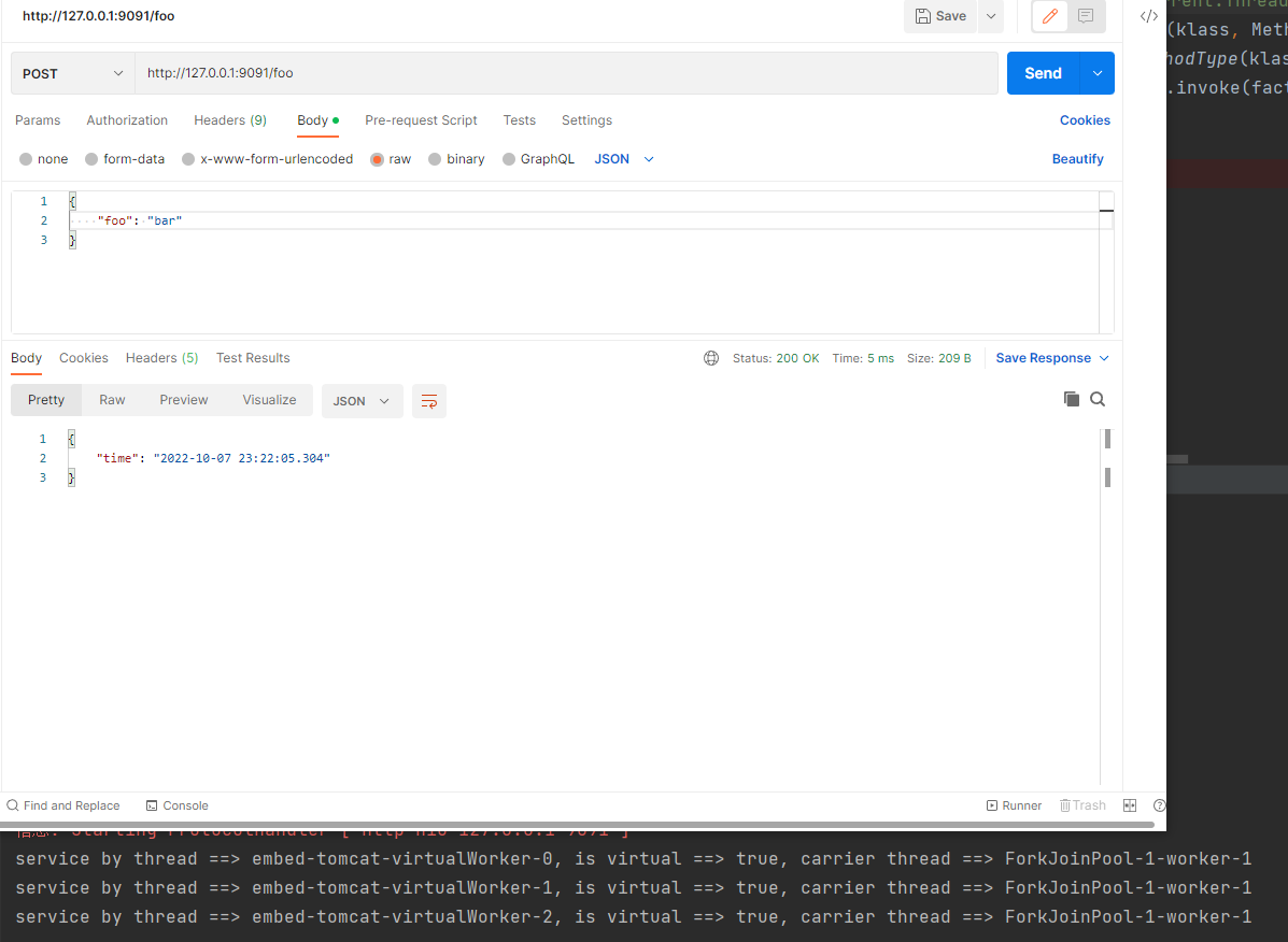 這里確認了Tomcat啟動完成偵聽127.0.0.1:9091,通過瀏覽器或者POSTMAN發送任意請求例如http://127.0.0.1:9091/foo就能看到響應結果和控制臺輸出: