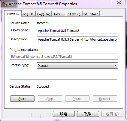 然后啟動tomcat ,使用命令 start tomcat8w.exe,或者在E: omcatin下雙擊tomcat8w.exe