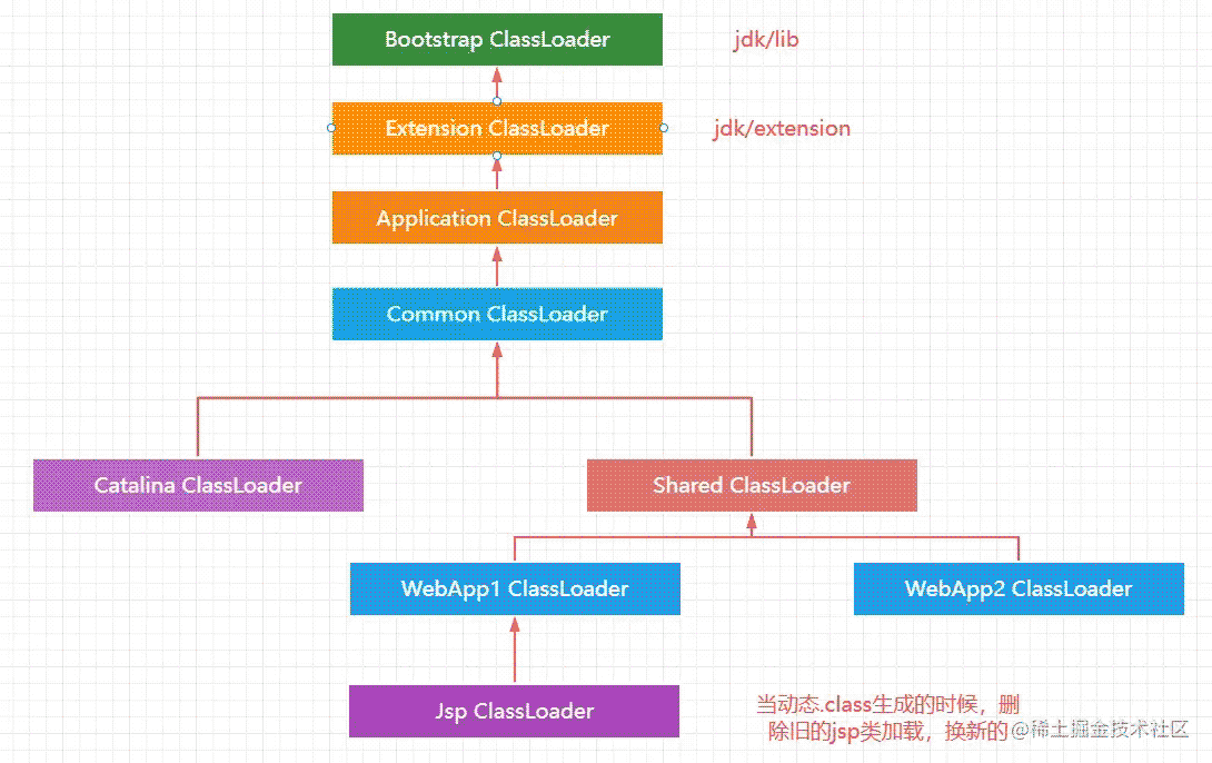 - (4).如果沒有,則從父類加載器加載,由于父類加載器采用默認的委派模式,所以加載順序是AppClassLoader、Common、Shared。