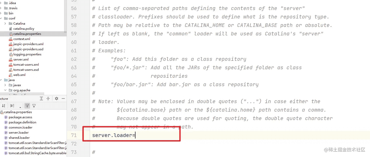其次,Catalina類加載器負責只有Tomcat應用服務器內部可見的類,這些類對Web應用不可見。比如,想實現自己的會話存儲方案,而且該方案依賴了一些第三方包,當然是不希望這些包對Web應用可見,這時可以配置server.load,創建獨立的Catalina類加載器。