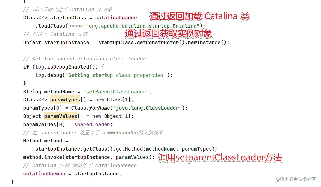 private void initClassLoaders() {try { // 創建 commonLoader catalinaLoader sharedLoader commonLoader = createClassLoader("common", null); if (commonLoader == null) {// no config file, default to this loader - we might be in a "single" env.commonLoader = this.getClass().getClassLoader(); } // 默認情況下 server.loader 和 shared.loader 都為空則會返回 commonLoader 類加載器 catalinaLoader = createClassLoader("server", commonLoader); sharedLoader = createClassLoader("shared", commonLoader);} catch (Throwable t) { handleThrowable(t); log.error("Class loader creation threw exception", t); System.exit(1);} }我們可以看到在initClassLoaders()方法中完成了CommonClassLoader, CatalinaClassLoader,和SharedClassLoader的創建,而且進入到createClassLoader方法中。