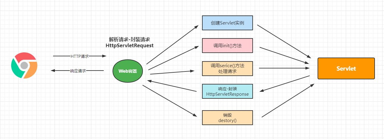 對應的服務器容器會接收到對應的Http請求,然后解析該請求,然后創建對應的Servlet實例,調用對應init方法來完成初始化,把請求的相關信息封裝為HttpServletRequest對象來調用Servlet的service方法來處理請求,然后通過HttpServletResponse封裝響應的信息交給容器,響應給客戶端。