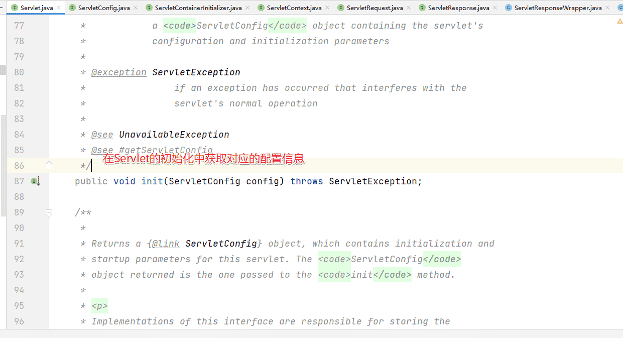 容器在初始化servlet時,為該servlet創建一個servletConfig對象,并將這個對象通過init()方法來傳遞并保存在此Servlet對象中。核心作用: