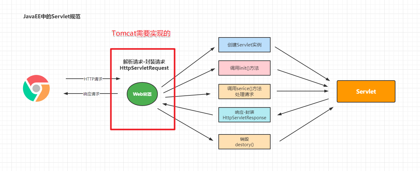 通過上面Servlet規范的介紹,其實我們發下我們要實現Servlet規范的話,很重要的就得提供一個服務容器來獲取請求,解析封裝數據,并調用Servlet實例相關的方法。也就是如下圖中的部分