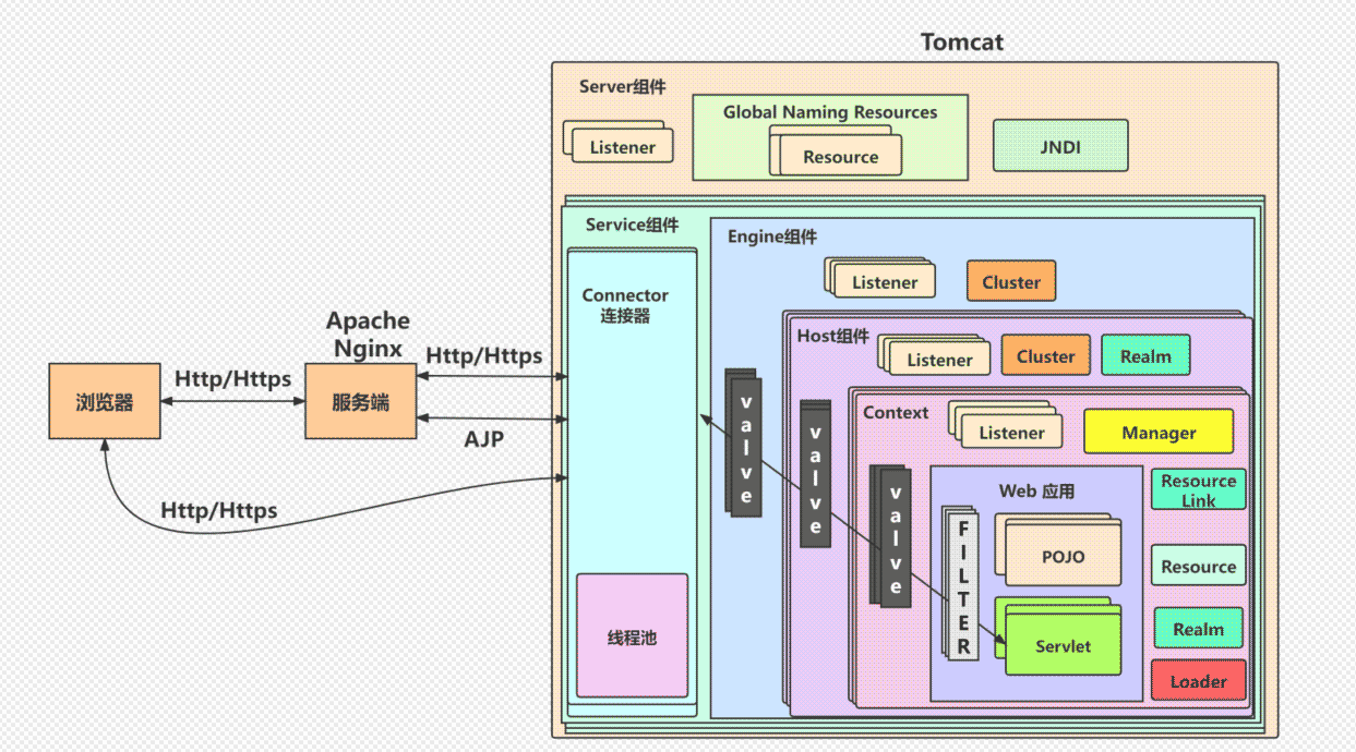 - Engine、Host和Context都是容器,且Engine包含Host,Host包含Context。每個Host組件代表Engine中的一個虛擬主機;每個Context組件代表在特定Host上運行的一個Web應用.