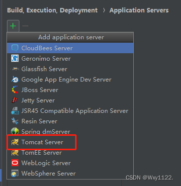 1.在File中選擇Settings,然后在“Build,Execution,Deployment”中選擇“Application Servers”,點擊“+”,就可以看到Tomcat Server了。