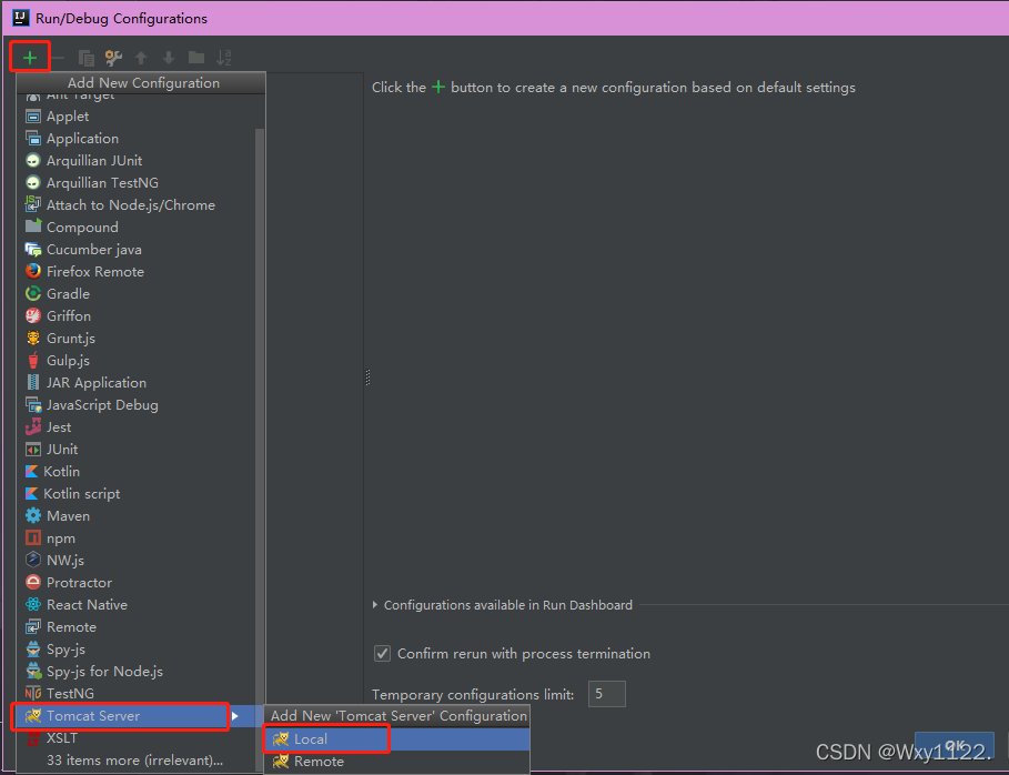 3.在Run-中選擇Edit Configurations…,在“+”中,就選擇Tomcat Server,點擊Local: