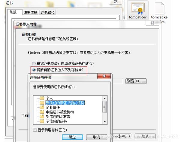 由于是自簽名的證書,為避免每次都提示不安全。這里雙擊tomcat.cer安裝服務器證書。