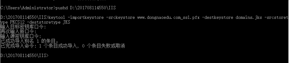 這里要輸入密碼,就是上面www.dongnaoedu.com_pfx_password.txt文本文件中的密碼,3個口令最好都輸入這個密碼。可以看到文件夾中生成了domains.jks證書