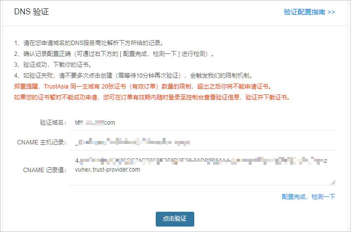 修改后,在freessl的DNS驗證頁面【點擊驗證】,此處需要注意一般得等幾分鐘才能驗證通過。