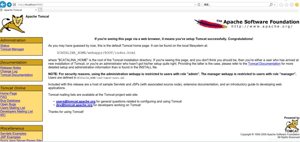 重新啟動tomcat,訪問瀏覽器地址 http://localhost:80(修改后的端口)啟動成功。