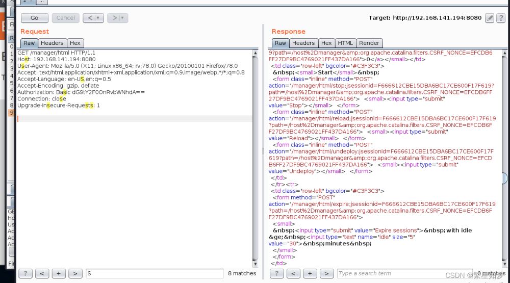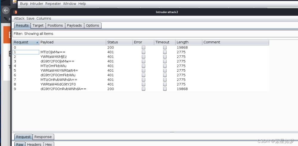 =其中沒有看到熟悉的賬號密碼,但是其中’Authorization: Basic dG9tY2F0OnRvbWNhdA=='將其中的base64字符串解密可以看到結果格式為"tomcat:tomcat"所以將請求包送至爆破模塊,構造格式為x:x的payload