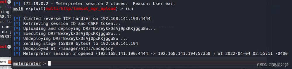 這里強調一下,在作者復現(xiàn)網(wǎng)上說的使用exploit/multi/http/tomcat_mgr_deploy但是在配置好rhoss和rport進行run的時候出現(xiàn)無法拿到shell問題