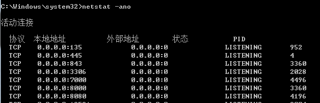 解決辦法:打開cmd,輸入netstat -ano,查看所有端口的占用情況,找到被占用端口8080的PID是4196