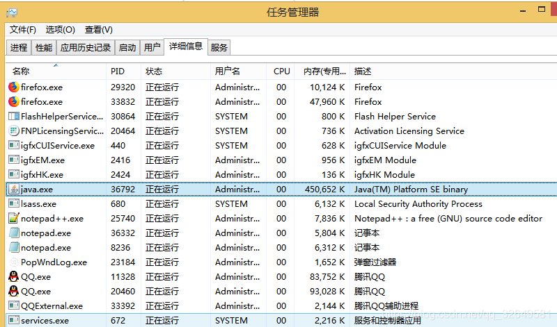 “任務(wù)欄”右鍵單擊選擇“任務(wù)管理器”,點(diǎn)擊“詳細(xì)信息”,找到PID列為4196的進(jìn)程,右擊殺掉這個進(jìn)程。再去點(diǎn)擊startup.bat??词欠袢匀婚W退。****