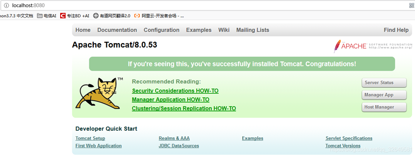 4.如果以上問題都解決了,在瀏覽器的地址欄中輸入“http://localhost:8080”,如果出現(xiàn)一個有小貓的界面,那就說明問題已經(jīng)解決了,但是如果仍然有問題,就按照上面的方法來檢查,看是哪兒出現(xiàn)了錯誤。打開的網(wǎng)址的時候前提startup.bat已經(jīng)在運(yùn)行。不然還是不能正常顯示的。