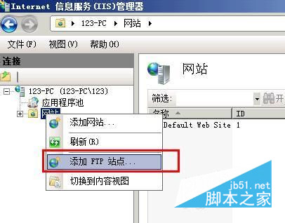 找到網(wǎng)站這個選項,右鍵單擊,然后選擇添加FTP站點