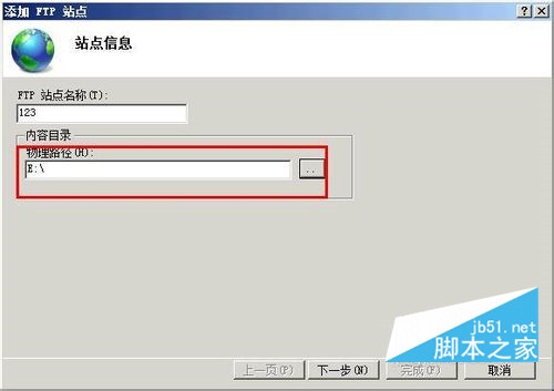 打開添加FTP站點的向?qū)Вo你的站點起一個名字,然后填寫物理路徑,這個路徑是你的FTP存放的文件夾的路徑,點擊右側(cè)的瀏覽按鈕可以瀏覽文件夾,選擇FTP的存放位置。點擊下一步