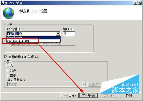 填寫IP地址,你可以看到下拉菜單中有你的電腦的ip,ssl設(shè)置成無就可以額。點擊下一步