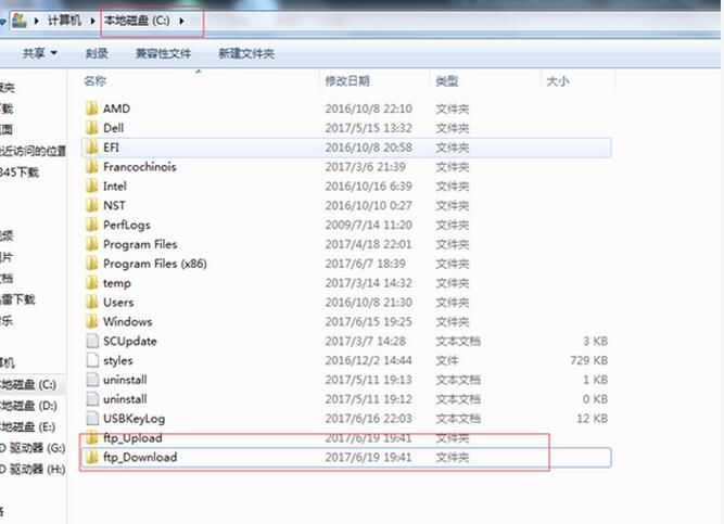 首先我們在C盤建立兩個文件夾,用于發ftp的上傳和下載